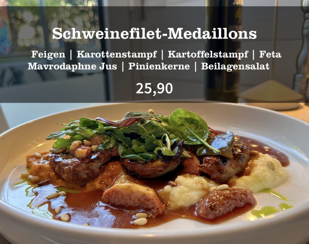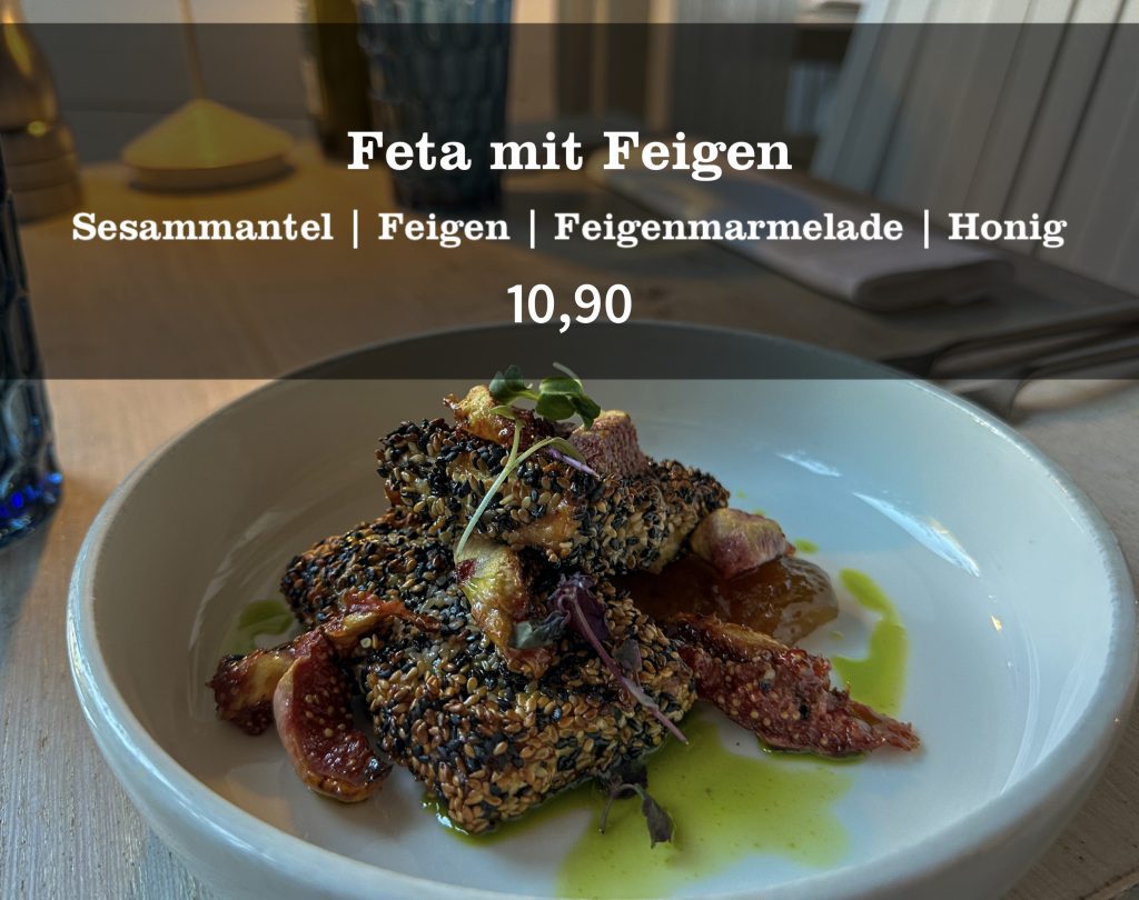 Feigen | Karottenstampf | Kartoffelstampf | Feta | Mavrodaphne Jus | Pinienkerne | Beilagensalat